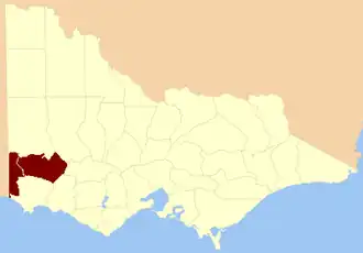 Later its borders were re-arranged somewhat and included the sub-divisions of Harrow, Casterton, Hamilton, Branxholme, Penshurst and Mortlake.[5]