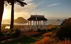 Elk was originally called "Greenwood," after the Greenwood brothers,[2] early homesteaders and sons of mountain man Caleb Greenwood and his half-Crow wife, one of the rescuers of the Donner Party. When the post office was opened, in 1887,[2] there was already another Greenwood in California so it was called Elk Post Office. Eventually the name came to refer to the town. It is an outgrowth of an earlier town called Cuffy's Cove and the cemetery is located at that townsite 1 mile (2 km) north of Elk. When pioneer lumberman Lorenzo White was unable to reach a satisfactory deal with the owners of the lumber chutes at Cuffy's Cove to ship out his redwood product, he constructed a wharf out along a string of rocks in the center of what is now Elk. When he built a large steam sawmill and 3-foot (90 cm) gauge railroad, the new employment drained the town of Cuffy's Cove, which was eventually abandoned. The sawmill was producing 80,000 board feet (200 m3) of lumber per day by 1890. The mill was sold to Goodyear Redwood Company in 1916. Elk River Company took over the sawmill when Goodyear went bankrupt in 1932. The local redwood lumber industry economy collapsed when the uninsured sawmill burned in 1936.[3]