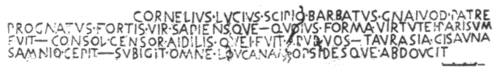At the beginning, as cited by Cicero, the funerary elogium was a short poem in saturnine verses praising the virtues of the deceased. Augustus wrote such an epitaph in verse as an inscription on the tomb of his adoptive son Drusus (died 9 BC). In the Tomb of the Scipios, a republican funerary monument on the Appian Way, funerary inscriptions on the sarcophagi of the Scipions can be considered elogia.[3] The elogia of the Scipios, composed later than 240 BC, are in saturnian metre, in archaic Latin, and show the increasing Hellenisation of Roman society. In fact, alongside the typically Roman values of Virtus and physical strength, those of beauty and wisdom, representative of the Greek culture, appear.[8] Below is the elogium of Lucius Cornelius Scipio, son of Lucius Cornelius Scipio Barbatus, whose elogium is also extant:[8]