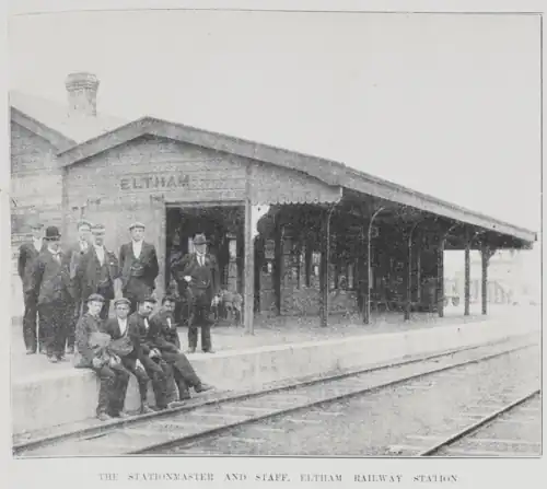 The stationmaster and staff at the Eltham railway station posing on 11 December 1902.