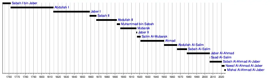Mishal Al-Ahmad Al-Jaber Al-SabahNawaf Al-Ahmad Al-Jaber Al-SabahSabah Al-Ahmad Al-Jaber Al-SabahSaad Al-Salim Al-SabahJaber Al-Ahmad Al-SabahSabah Al-Salim Al-SabahAbdullah Al-Salim Al-SabahAhmad Al-Jaber Al-SabahSalim Al-Mubarak Al-SabahJaber IIMubarak Al-SabahMuhammad bin Sabah Al-SabahAbdullah II Al-SabahSabah IIJaber IAbdullah I Al-SabahSabah I bin Jaber