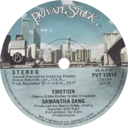 Originally, "Emotion" was recorded by Samantha Sang for the Private Stock label. The song was Sang's only hit single, reaching number 3 on the Billboard Hot 100. Billboard ranked her version as the No. 14 song for 1978. There is a promotional video made for this song.