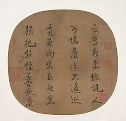 Emperor Lizong was a skilled poet and calligrapher.[21] The Metropolitan Museum reports, "Lizong was the finest calligrapher among the Song emperors who came after Gaozong (r. 1127–62)."[21] Lizong developed his own unique calligraphic style which was easily recognizable as it showed sharp and rapid brush strokes. The Metropolitan Museum says, "Lizong developed his own unique manner, which was distinguished by angular brushstrokes with straight rapid brush movements—in contrast to the slower, more rounded brushstrokes of Gaozong—and by his preference for Tang, rather than Jin, dynasty models."[21] Emperor Lizong also expresses his feelings in his poems as shown in his poem 'Quatrain on Late Spring' which reads: