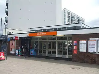 Enfield Town railway station is the terminus of the Enfield Town branch of the Lea Valley Lines, located in Enfield Town, north London. It is one of three northern termini of London Overground's Weaver line, 10 miles 55 chains (17.2 km) down the line from London Liverpool Street.