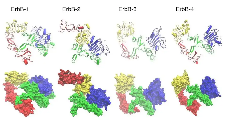 The figure below shows the tridimensional structure of the ErbB family proteins, using the pdb files 1NQL (ErbB-1), 1S78 (ErbB-2), 1M6B (ErbB-3) and 2AHX (ErbB-4):[10][11][12][13]