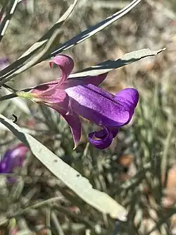 • Eremophila phyllopoda subsp. obliqua Chinnock[7] that flowers from June to August and has leaves that are 18–50 mm (0.7–2 in) long and petals that are less than 25 mm (1 in) long.[3]
