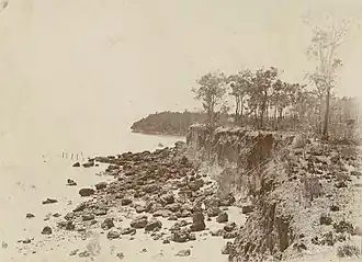 In 1864, the year after South Australia was granted control over the Northern Territory, the South Australian government decided that settlement of the area was desirable and sent a surveying and settlement expedition under the command of Lieutenant Colonel Boyle Travers Finniss, a former Premier of South Australia. He had been instructed to establish the settlement at Adam Bay and chose the Escape Cliffs site despite disagreements with other members of his party. It was intended to cover settlement costs through sales of land, much of which had already been presold to speculators and intending settlers even before the expedition reached the site and began their survey work.[5] Finniss believed that the site could produce tropical vegetation and would be suitable for wool-growing and cattle farming.[6]