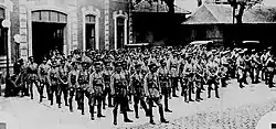 The teaching staff was made up of professors and instructors, respectively responsible for theoretical and practical content, in addition to adjuncts.[83] Students only started to be called cadets after 1931.[84] They were militarily organized into one or more student companies, which gave way to a Student Corps (later Cadet Corps) after 1918, with subunits of the four branches (infantry companies, grouped in a battalion, engineering company, artillery battery and cavalry squadron),[a] commanded by the instructors.[85]