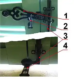 The espagnolette mechanism consists of a vertical rotating rod (3) that is mounted using sleeves onto the inner face of the window sash (traditionally on the rebate or strike edge). The rod is centrally connected to a decorative lever arm (1), also known as a paddle or handle, which is hinged and rotates outward from a metal keeper bracket (2). When pulled, this action rotates the rod, which engages or disengages forged hook-shaped ends at the top and bottom. These hooks catch behind metal pins (called "stops" or "studs") mounted on the frame — one of which is visible at the floor (4). In the closed position, the handle may also latch into a fixed frame-mounted hook, ensuring secure locking. This setup allows tall sashes to be locked at both ends simultaneously.[2]