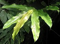 Etlingera maingayi grows to less than 2 m (6 ft 7 in) high.[6] Its leaves are variable, with undulating fringes, and emit a sour scent when crushed.[7] Young leaves are translucent and reddish on both sides.[5]