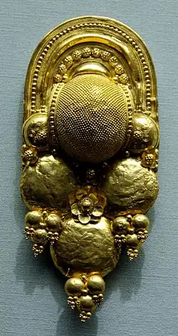 Granulation was the art of decorating smooth surfaces of gold jewelry with patterns composed of tiny granules of gold. It was invented in Mesopotamia in the third millennium BC and was subsequently introduced to Anatolia, Syria, Egypt, Cyprus and Mycenaean Greece. The collapse of the Bronze Age civilization brought with it the disappearance of such sophisticated arts in Greece, but they survived in the Near East and from there they were reintroduced in Greece in the 9th century and transferred to Italy during the second half of the 8th century.
