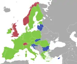The following table shows the status of each state membership to the different agreements promoted by the EU. It lists 47 countries, including the 27 EU member states, 9 candidate states, 3 members of the EEA and Switzerland, Kosovo which has applied for membership, 4 microstates, and the United Kingdom and Armenia as special cases.