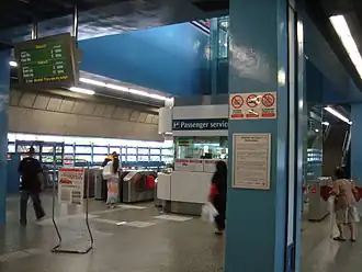 Concourse level of Queenstown Station, showing a Conrac plasma display, passenger service centre, and faregates