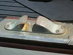 A fairlead is a turning point for running rigging like rope, chain, wire or line, that guides that line such that the "lead" is "fair", and therefore low friction and low chafe.[1] A fairlead can be a hook, ring, pulley, chock, or hawse (hole) sometimes surrounded by rollers.