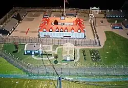 The camp inmate population grew steadily, new buildings were erected. Prison barracks were built southeast of the main building, utility buildings were constructed around the center, and the commander's quarters were erected nearby on the other side of the river. In all, the grounds were monitored from three watchtowers.[7]