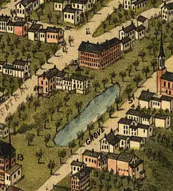 Inhabitants of the Northwest Parish were taxed to support both the meetinghouse and minister on Rochester Hill about 12 miles (19 km) away, a distance which made attendance difficult. A movement began in the 1770s to establish a separate township, and in 1783 a petition for charter was submitted to the state legislature. It was denied, but another petition in 1798 was granted. With about 1,000 inhabitants, Farmington was incorporated.[8] In 1800, a 40-by-50-foot (12 by 15 m), two-story meetinghouse was erected on Meetinghouse Hill. The same year, John Wingate established a blacksmithy. He would also become proprietor of Wingate's Tavern.