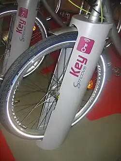 The lock that is on the bicycle, situated in the fork. It secures the bike in the stations and outside the stations with an auto-winding cable. The system won some recognition by mayors and in the industry for it reliability, its moderate price and the fact that it is not linked to an advertising deal.[3][4]