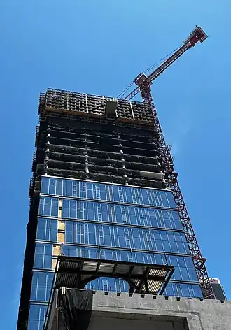 In February 2020, officials broke ground on the project. Crews cleared the site of its parking lot before beginning construction at a later date.[1] Australian multinational construction company Lendlease was selected as the project's contractor.[7] In March 2021, a crane arrived on the site and vertical construction began.[8] On October 7, 2022, officials announced the topping out of the building.[2] In November 2023, Mitsui began leasing units with an expected move-in date in early 2024.[9] Mitsui marked the building's completion with a dedication ceremony on March 14, 2024.[3]