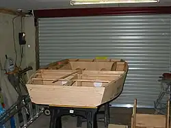 The Firebug is constructed on a rigid jig with 6 timber stringers and a centerline web. The flat bottom is 600 mm wide and is made from 9 mm marine plywood. The sides, bilge panels bulkheads and deck are cut from 2.5 panels of 4 mm marine plywood. The minimum weight of the completed hull is 40 kg[3] (sometimes cited as 27 kg[4]).