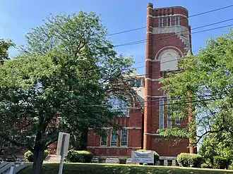 First Baptist Church is a historic Baptist church located at Geneva in Ontario County, New York. The church was constructed in 1893-1894 and is an example of Romanesque Revival style. Constructed of brick with limestone accents, the main block is surmounted by a profusion of tower, turrets, and cross gables. The front facade is flanked by two massive square towers.[2]