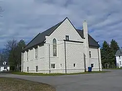 First Presbyterian Church of Ontario Center is a historic Presbyterian church located at Ontario Center in Wayne County, New York. It was built in 1914 and is a Tudor Revival style concrete block church cast to resemble rusticated masonry. It is roughly square in plan and topped by a cross gable roof. The front facade features a massive square corner tower capped with a crenelated parapet.[2]