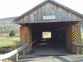 Fitch's Bridge is a wooden covered bridge over the West Branch of the Delaware River. It is in the town of Delhi and is one of 24 covered bridges in New York State. It was originally erected in 1870 in the village of Delhi, and moved to its present location in 1885. The single-span, timber bridge measures 106 feet (32 m) long and 20 feet (6.1 m) wide.[3]: 5