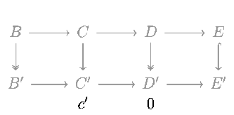 - By exactness, c′ − n(c) is in the image of s, so there exists b′ in B′ with s(b′) = c′ − n(c).