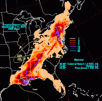 In early September, the remnants of Tropical Storm Lee had stalled due to Hurricane Katia. As a result, the main cyclone stalled over the Midwest, and a cold front associated with Lee stalled over the Northeastern states. This drew tropical moisture into the Mid-Atlantic. Over 1 1/2 feet of rain fell in some areas from September 3 to 7. Moisture from Hurricane Irene had already saturated the ground little over a week before, leaving the runoff plunging straight into waterways. Streams and creeks throughout the region flooded, as well as moderate flooding of the Delaware River in some spots. The worst of the flooding stayed in the Susquehanna River area. Both the West Branch and North Branch, as well as most of their tributaries, flooded. Flood damage was sustained in a swath from southern New York to the mouth, located at Havre de Grace in northern Maryland. Record flooding occurred in the Binghamton, New York region, and in northeastern and central Pennsylvania. In Wilkes-Barre, the water was measured at 42.66 feet, an astounding number compared to the record of 40.90 feet Hurricane Agnes set in 1972. Municipalities along the river sustained major damage, many households and businesses among them declared condemned. The Bloomsburg Fair, an event in Bloomsburg since 1855, was canceled for the first time. Damages for the disaster were in the tens of millions (USD), if not hundreds.[22]