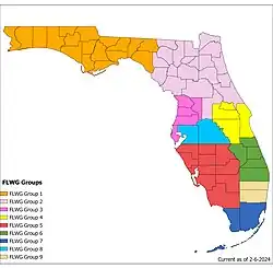 Florida Wing is divided into nine groups across the state, with each squadron or flight being assigned to a group based on its geographical location. The Wing comprises 21 Cadet Squadrons, 7 Senior Squadrons, 29 Composite Squadrons (composed of both Cadets and Senior Members), and the Support and Legislative Squadrons.[9]
