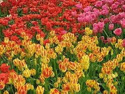 Besides the tulip, the work shows the following flower species: Rosa gallica, Anemone hepatica, Aquilegia, Tagetes, Cyclamen, Lacerta agilis, Vanessa cardui, a fly, a dragonfly, and a grasshopper (on the vase).[2]