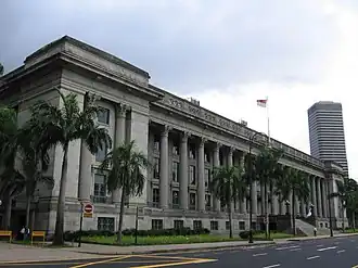 The Municipal Building was planned and designed by the municipal architect S. D. Meadows, and then by Alexander Gordon, who took over the position in 1925. The London construction firm Perry and Co. (Overseas) Ltd. began in 1926 and was completed in 1929.[1] By April the municipality moved into its new home. The Governor Hugh Clifford then officially opened the new Municipal Building on 23 July 1929. During World War II, when the Japanese occupied Singapore, they managed civic issues from the Municipal Building. Political affairs were already being conducted in the building. In 1943, the leader of the Indian National Army, Subhas Chandra Bose, rallied for Japanese support to help India be independent of British rule at the Municipal Building. British prisoners-of-war were rounded up in front of the building to march to POW camps such as Changi Prison and Selarang. On 12 September 1945, the Imperial Japanese Army official Seishirō Itagaki surrendered to Lord Mountbatten in the building to end World War II in Singapore.[2] In 1951, it was renamed to its present name City Hall to mark Singapore as a city, after being granted city status.[1]