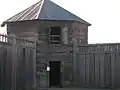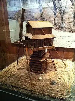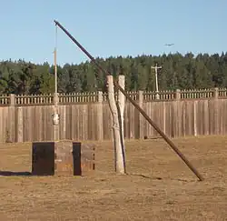 Much archaeological research has been done at Fort Ross, more recently in search of the windmills. The historical record states there were at least three windmills, possibly four, although the fourth may have been a watermill or a man- or animal-powered mill.[38] The windmills have gained much attention because various accounts of their exact locations are sometimes inconsistent and vague. There was, in fact, one windmill located not far from the northern end of the blockade, which was most likely used to grind wheat and barley flour.[38] Based on the descriptions given by people who visited Fort Ross, it has been concluded that the main windmill, located outside the blockade, was the traditional style Russian stolbovki.[38] The root word "stolb" means thick vertical pole.