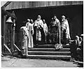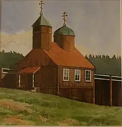 The Fort Ross Chapel collapsed in the 1906 San Francisco earthquake but much of the original structural woodwork remained and it was re-erected in 1916, but retained the appearance of the American ranch-period modifications when it was used as a stable.[27] Several other restorations ensued, but none incorporated the information in Voznesensky's 1841 water-colour which portray the chapel with copper-clad cupola and tower, and red-metal roof.[27] "The Fort Ross Chapel was found eligible for designation as a National Historic Landmark in 1969, architecturally significant as a rare U.S. example of a log church constructed on a Russian quadrilateral plan. An accidental fire destroyed the chapel on October 5, 1970. This loss of the original workmanship and materials of the chapel led to withdrawal of the Chapel's Landmark designation in 1971. A complete reconstruction of the chapel was undertaken in 1973 and the Fort Ross settlement, as a whole, retains its National Historic Landmark designation."[28] The current chapel was built during the intensive restoration activity that followed, but retains the American ranch period appearance.
