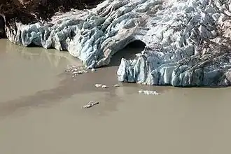 Terminus of Fourpeaked Glacier with dark-colored sediment issuing from an elongate tunnel in the ice. Photo taken Sept 20, 2006