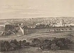 The sailing voyage ended in Alexandria, Egypt, from which the delegation continued to Cairo and farther south to take photographs of the Pyramids and various other sites. From Cairo, the delegation travelled by land to Jerusalem, where they stayed from December 11 to 14, 1839.[1] During this time, Fesquet photographed Jerusalem from the Mount of Olives, including the Temple Mount, the city walls, and its surroundings.[13][14] From Jerusalem the expedition continued to Acre, where Fesquet photographed the old city from its rooftops, the people staying there, and the Crusader fortress in the background. Finally, he photographed the city of Nazareth and its surroundings. From Nazareth, the delegation continued to Damascus, then Turkey, and returned to Paris in the beginning of 1840.