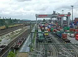 After the closure of the central Frankfurt freight yard, the Frankfurt East station became the centre of freight handling in Frankfurt. The freight yard was expanded from about 2003 to house a container terminal. A large area to the east of the station (which had previously been used for the Frankfurt Main East railway workshop) was redeveloped as a storage space for containers and transport vehicles along with arrival and departure routes to the road network. Complete freight trains are run from the East station yard mainly for the automotive and mining industries.