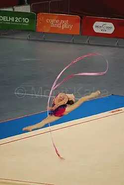 Jones performing with the ribbon at the 2010 Commonwealth Games