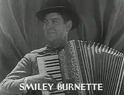 Lester Alvin Burnett (March 18, 1911 – February 16, 1967), better known as Smiley Burnette, was an American country music performer and a comedic actor in Western films and on radio and TV, playing sidekick to Gene Autry, Roy Rogers, and other B-movie cowboys.[1] He was also a prolific singer-songwriter who is reported to have played proficiently over 100 musical instruments, sometimes more than one simultaneously.[2] His career, beginning in 1934, spanned four decades, including a regular role on CBS-TV's Petticoat Junction in the 1960s.