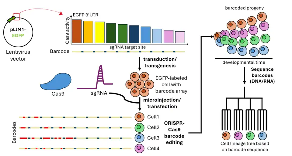 Initiation of barcode editing and labeling of cells is done by introducing the Cas9 protein and sgRNAs into progenitor cells. The CRISPR-Cas9 complex randomly produces double-stranded breaks in the barcode regions and subsequent NHEJ repair introduces random indels, resulting in a unique DNA sequence at the barcode region in each cell at time of labeling. There are multiple methods of delivering the CRISPR-Cas9 reagents into cells and it is an active field of research.[16] CRISPR-Cas9 reagents can be introduced into cells via transfection using lipid nanoparticles.[16] Alternatively, microinjection of the CRISPR-Cas9 reagents can be performed on 1-cell embryos.[17] The delivery of CRISPR-Cas9 reagents can be done at different developmental times to change the labeled populations. Barcode editing may persist for several hours after delivery.[1]
