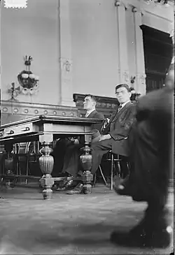 On February 27, 1919, Galleani spoke to an anarchist gathering in Taunton, Massachusetts.[28][29] The next night four Galleanists who had attended the rally attempted to place a bomb at the American Woolen Co. mill in nearby Franklin, whose workers were on strike.[28][2] The bomb exploded prematurely, killing all four of the men.[28][29][30][2] In late April 1919, approximately 36 dynamite package bombs, all with identical packaging and addressed to a cross-section of politicians, justice officials, and businessmen, including John D. Rockefeller, were sent through the mail.[4] An early lead to the identity of the bombers was revealed when one package bomb was found addressed to a Bureau of Investigation (BOI) field agent, Rayme Weston Finch.[4] Finch had been tracking several Galleanists, including Carlo Valdinoci, and the agent's successes, such as leading the raid on Cronacca Sovversiva and his arrest of Raffaele Schiavina and Andrea Ciafolo, were well known to Galleanist militants.[4] The Galleanists intended their bombs to be delivered on May Day, the international day of communist, anarchist, and socialist revolutionary solidarity.[4] Only a few of the packages were delivered. Because the plotters had neglected to add sufficient postage, one of the packages was discovered, and its distinctive markings enabled the interception of most of the rest.[4] No one was killed by the mail bombs that were delivered, but a black housekeeper, Ethel Williams, had her hands blown off when she opened a package sent to the home of Senator Thomas W. Hardwick, a sponsor of the Immigration Act of 1918.[4]