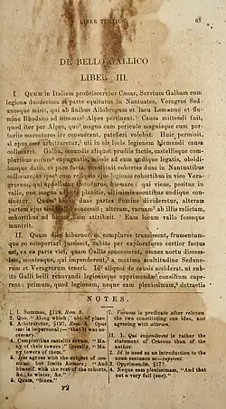 Caesar's Commentarii de Bello Gallico, in Latin, is one of the best surviving examples of unadorned Latin prose. It has consequently been a subject of intense study for Latinists and is one of the classic prose sources traditionally used as a standard teaching text in modern Latin education.[85][86] It begins with the oft-quoted phrase "Gallia est omnis divisa in partes tres", meaning "Gaul is a whole divided into three parts". The introduction is world-famed for its overview of Gaul.[87][88] The Gallic Wars have become a popular setting in modern historical fiction, especially that of France and Italy.[89] In addition, the comic Astérix is set shortly after the Gallic Wars, where the titular character's village is the last holdout in Gaul against Caesar's legions.[90]