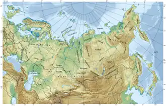 The Siberian craton (or West-Siberian craton) coincides with the Central Siberian plateau that lies between the Yenisei and Lena rivers. In the west it borders the West Siberian basin. The Yenisei-Katanga trough lies in the north. In the south lies the Central Asian fold belt, the Baikal rift and the Mongol-Okhotsk fold belt. The eastern border is the Verkhoyansk-Kolyma orogenic system.[26][27]