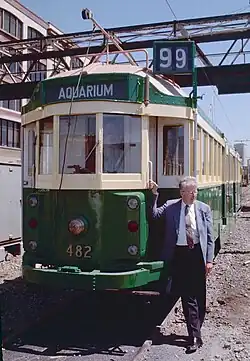 Benson posing with the first car of the Waterfront Streetcar line just after it was placed onto the tracks