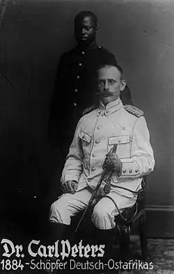 Carl Peters was born on September 27, 1856, in Hanover, Germany. Peters was awarded scholarships to attend college, where he studied history, philosophy, and law, and became a successful journalist.[5] After some time, Peters became interested in colonization, and he then changed his focus in life to become one of the principal founders of the German East Africa Company.[6] He made significant contributions towards the company, which made him a widely recognized explorer. For example, Peters convinced the indigenous peoples of East Africa to give Germany control of their land, allowing Germany to have a colony in East Africa. He was able to do this by impressing the natives by firing guns, wearing impressive clothing, and flying flags.[7] After the Germans took control, Peters became the administrator of the region until his dismissal because of his brutal treatment of the natives. He was known by the natives as "mkono wa damu", meaning "the man with blood on his hands". He was put on trial and found guilty, although the decision was criticized by the German press. His poor treatment of the indigenous people earned him an end to his otherwise successful career, and because of the extreme negative response, he lost most of his prestige; many streets named after him have since been renamed, and he is neglected by most historians.[8]