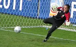 At the 2013 European Championship in Sweden, the Germans won their sixth straight continental title, with the decisive game being a 1–0 victory over Norway. Goalkeeper Nadine Angerer, who stopped two penalties during the final, was chosen as the tournament's best player.[44] The 2015 FIFA Women's World Cup had Germany again reaching the top four. In the semi-final against the United States, Célia Šašić, who wound up as the tournament's top scorer, missed a penalty, and afterwards goals by Carli Lloyd and Kelley O'Hara lead to an American victory.[45] The third place match saw the Germans lose their first ever match to England after 21 contests, due to a penalty kick by Fara Williams during extra time.[46]