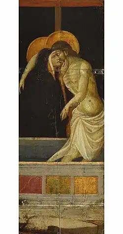 Giovanni dal Ponte (1385 – c. 1438 in Florence) was a Florentine minor master painter of the late-Gothic period, known as one of the greatest minor masters contemporary to Masaccio. He is known by Giorgio Vasari as dal Ponte, a name derived from the location of his studio at the Piazza di Santo Stefano a Ponte.[1] Many other documents cite his name as Giovanni di Marco. After joining the Arte dei Medici e degli Speziali in 1410 and the Compagnia di S Luca in 1413, dal Ponte opened his studio in the late 1420s and hired Florentine painter Smeraldo di Giovanni as his assistant.[2] Smeraldo was hired after dal Ponte was imprisoned in 1424 due to failure to repay his debts, with the intention that Smeraldo would manage the logistical aspects of the workshop in addition to his artwork. Dal Ponte used his craftsmanship to create not only Panel paintings, but also frescoes and decorations for small objects. Dal Ponte's work is considered to be of the Late Gothic style, though he assimilated the stylistic preferences of his contemporaries; Lorenzo Monaco, Masaccio, and Lorenzo Ghiberti served as his primary influences.