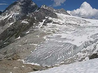 Due to its location near the highway and railway, the Illecillewaet Glacier is the most visited and photographed. Formerly known as the Great Glacier, it was a major tourist attraction during the Glacier House period from 1886 to 1925. The glacier's terminus, formerly a short walk from the Glacier House site, has retreated far up the mountainside. The névé of the glacier spreads far to the south, also spawning the Geikie Glacier. Most of the large glacial features are south of the Trans-Canada corridor. Other large features include the Deville, Dawson, Asulkan, Bishops, Black, Duncan, Grand, and Avalanche. The park's glaciers have a variety of appearances, with high altitude features smooth and uniform, cracked and riddled with crevasses on the slopes, and black with debris on the valley bottoms. In summer, many of the glaciers take on a red tint; this is the result of a variety of snow algae known as watermelon snow.[25]