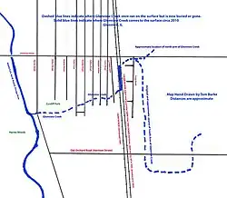 A 1910 map shows Glenview Creek had an arm that at one time originated near the current intersection of the Edens Expressway and Old Orchard Road (formerly Harrison Street), then farmland. This long arm arising in the south is labeled as a ditch which crosses Harrison Street twice before heading north towards the main stem near Glenview Road. Another arm travels from the northeast to the southwest where it joins the arm coming up from Harrison Street on Glenview Road. The Chicago & North Western (C&NW) tracks cross on a trestle four feet high over the creek per the map label. The map gives a key coordinate, showing the trestle over Glenview Creek being precisely 1800 feet north of Harrison Street which validates its identity and location.[1]