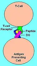 Illustration of HLA-DQ with peptide in the binding pocket HLA DQ Receptor with bound peptide and TCR