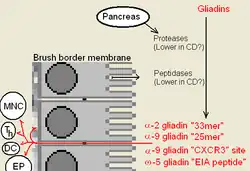 Some alpha gliadin have other direct-acting properties. Other gliadin peptides, one in a glutamine rich region and another peptide, "QVLQQSTYQLLQELCCQHLW", bind a chemoattractant receptor, CXCR3. Gliadin binds to, blocks and displaces a factor, I-TAC, that binds this receptor.[2] In the process it recruits more CXCR3 receptor, increases MyD88 and zonulin expression.[1][9] The factor it displaces, I-TAC, is a T-cell attractant. This peptide may also be involved in increased risk for type 1 diabetes as zonulin production is also a factor.[10] This triggering of zonulin ultimately results in the degradation of tight junctions allowing large solutes, such as proteolytic resistant gliadin fragments to enter behind the brush border membrane cells.